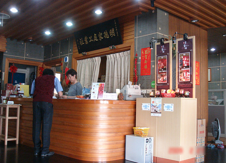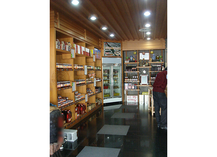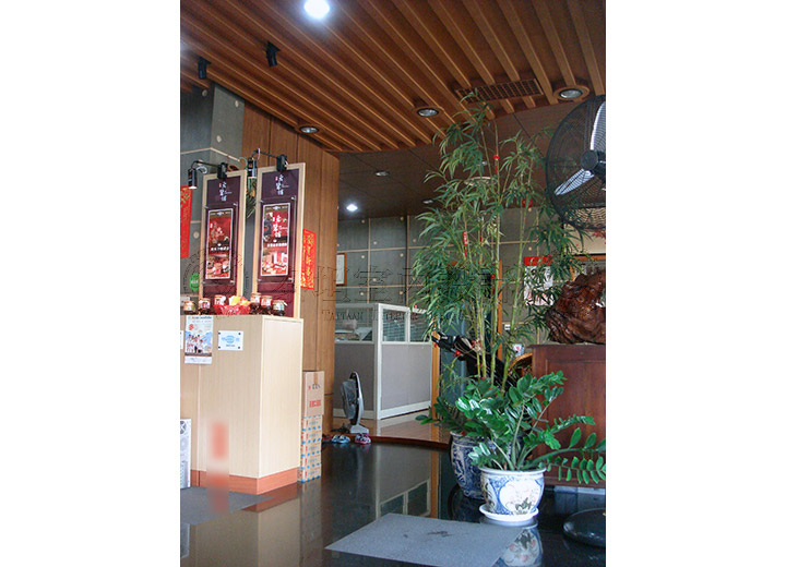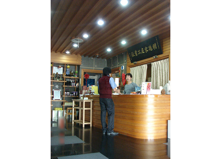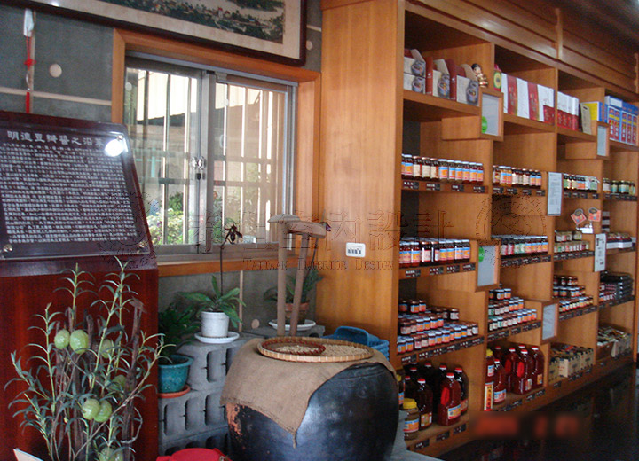 也是劉老闆的要求(要耐用),天花板也跟隨同一理念的設計,再加上包裝台(兼收銀台)也是檜木施工,全室發出一種古色古香兼具時代性特色的風華,